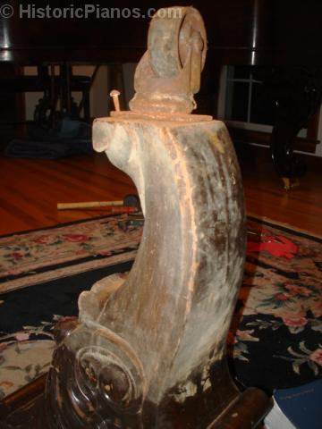 Damaged leg, missing scrollwork, and rusty steel caster.