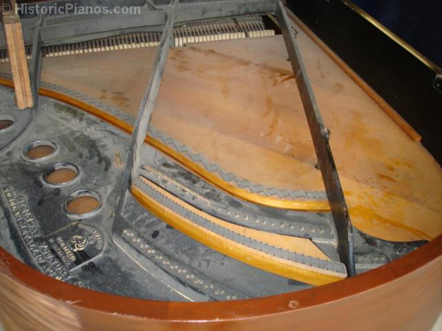 The piano in pieces, partially stripped and unstrung with pinblock removed and stringplate stripped bare