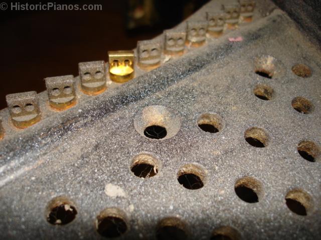 Detail showing fouled and corroded agraffes, with one replacement new agraffe at center